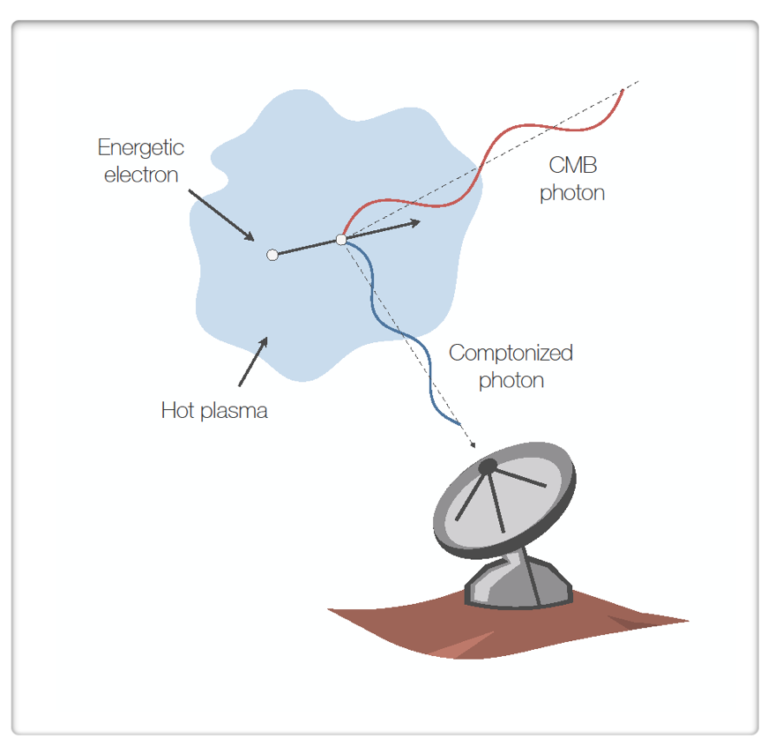These early universe photons can be deflected by electrons just hanging about in space, typically near massive galaxies. If we think of the photon as a tiny bouncy ball and an electron as a big beach ball floating in space, we can imagine that the bouncy ball could bounce off the beach ball. Most of the time when the photon bounces off, or is scattered by, the electron it ends up with more energy than it had in the first place. Imagine the bouncy ball and the beach ball again. If the beach ball is moving 50 miles an hour towards the bouncy ball, and they collide, the bouncy ball will be going faster after the collision than before – because the thing that hit it was going so fast! If the bouncy ball is moving faster, it has more energy. For photons, having more energy means that they are at a higher frequency – they are ‘bluer light’.